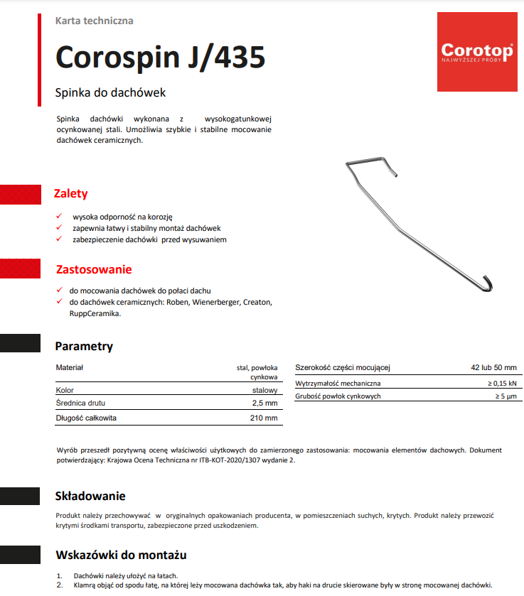 COROSPIN J/435 najpopularniejsza uniwersalna spinka do dachówek ceramicznych. Mocowanie dachówek spinkami za boczny zamek lub jednocześnie za boczny i górny zamek jest rozwiązaniem optymalnym ze względu na występujące w obszarze dachu siły ssące wiatr. Spinki wykonane są z drutu powlekanego żelazem z dodatkiem cynku-aluminium. Wykazują odporność na korozyjne działanie opadów atmosferycznych.